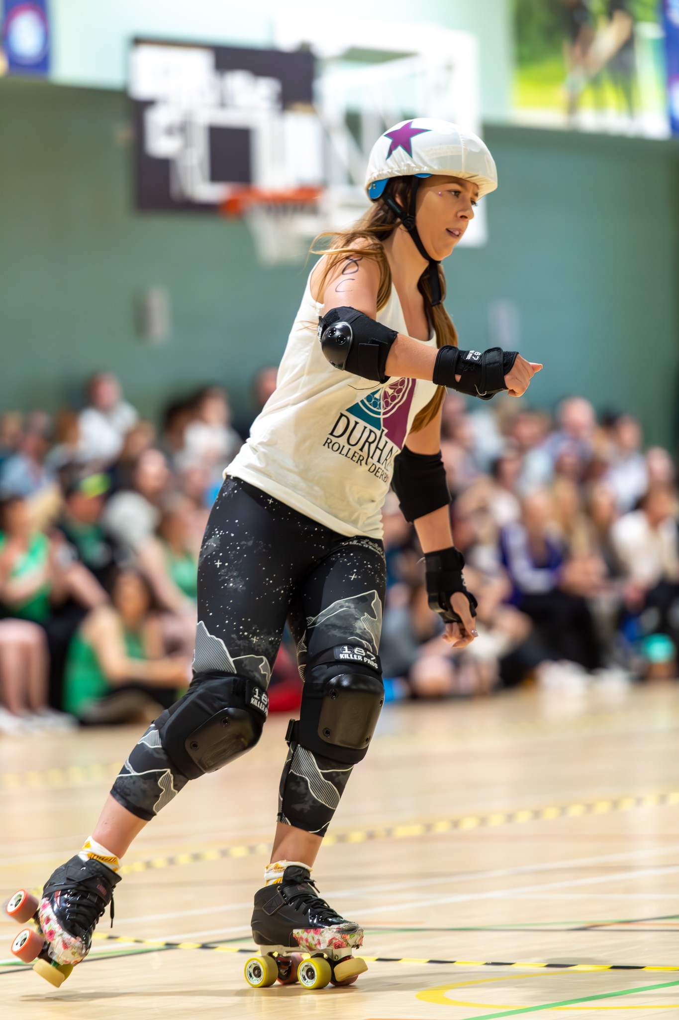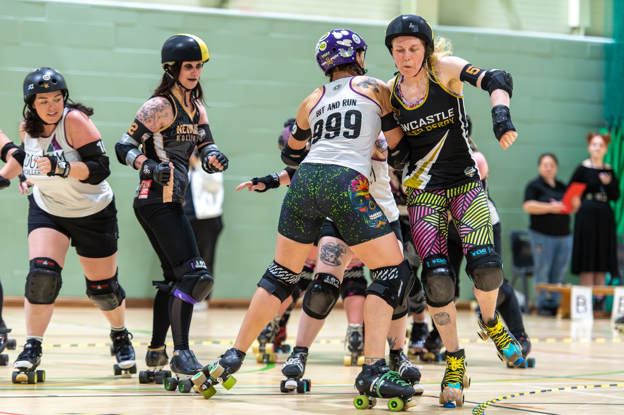 Our A team is competing in Tier 3 of the Five Nations Roller Derby Championships, and our B team is currently under development.