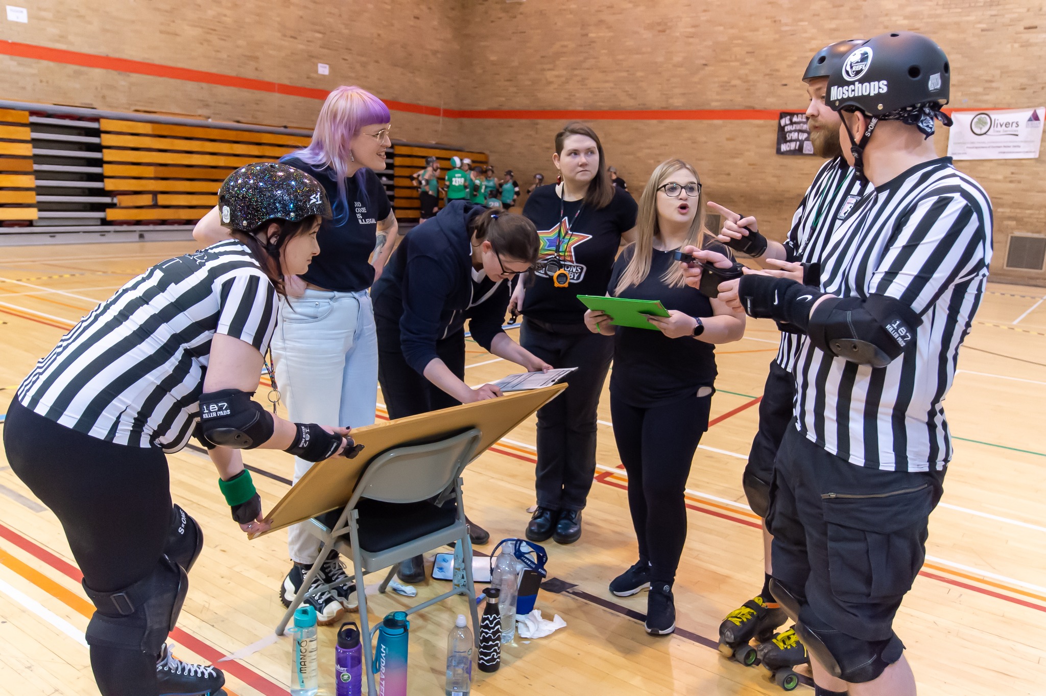 Durham Roller Derby are continuing to develop our referees and non-skating officials (FYI, each game requires seven referees on skates and fourteen officials off skates!) Games quite literally wouldn’t happen without their constant support and skills. We are fortunate to have support and opportunities to learn with and play with other leagues too.